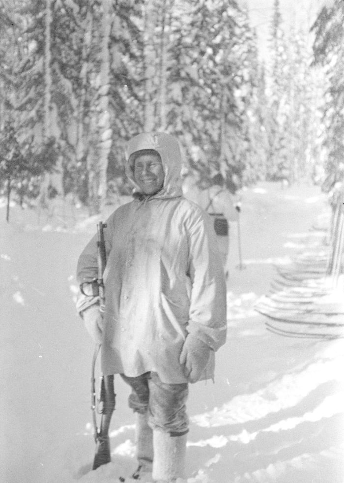 Simo Häyhä Loimolassa helmikuussa 1940. Puna-armeijan ”Valkoiseksi kuolemaksi” nimittämä tarkka-ampuja vei kolmessa kuukaudessa yli 500 vihollissotilaan hengen. Kuva: SA-kuva.