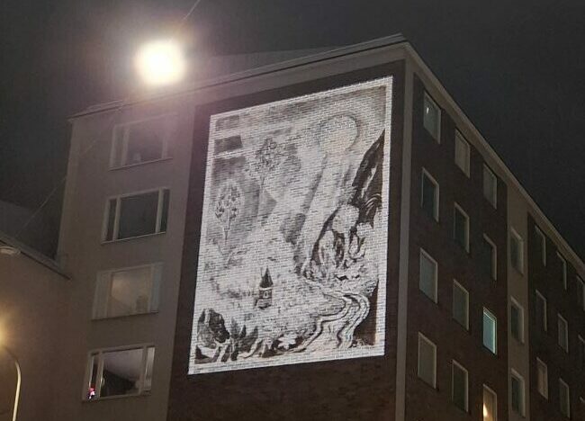 Yhteensä 15 kuvaa Tove Janssonin ensimmäisestä muumitarinasta Muumit ja suuri tuhotulva (1945) heijastetaan iltaisin Tammerkosken länsipuoleisen keskustan rakennusten seinille tarinaksi, jota voi seurata talolta toiselle.