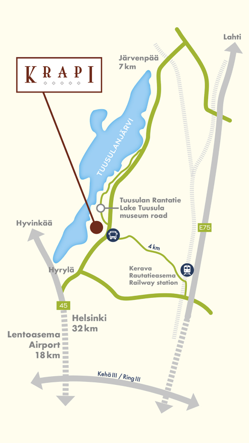 Krapi sijaitsee historiallisella Tuusulan Rantatiellä, joka on tunnettu suomalaisen taiteen ja kulttuurin keskuksena.