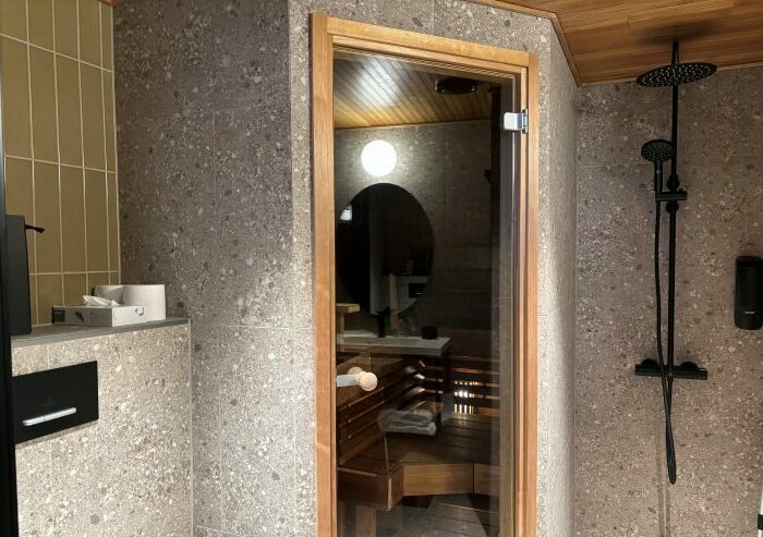 Sauna oman huoneen yhteydessä tarjoaa yöpyjälle mukavaa luksusta.